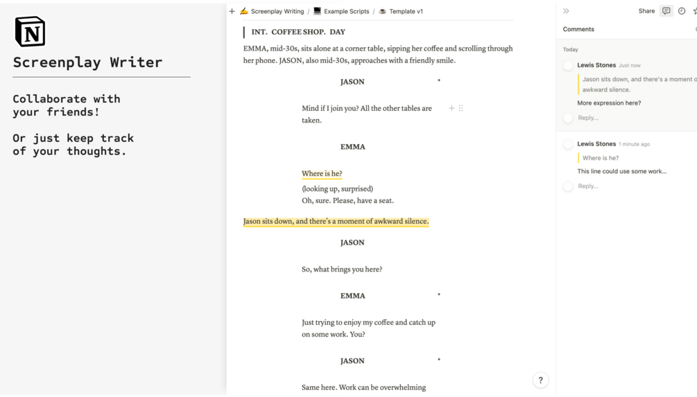 π Cross-Platform Compatibility: Access your screenplay anytime, anywhere! Our template seamlessly integrates with Notion's cross-platform capabilities, allowing you to switch between devices without missing a beat.